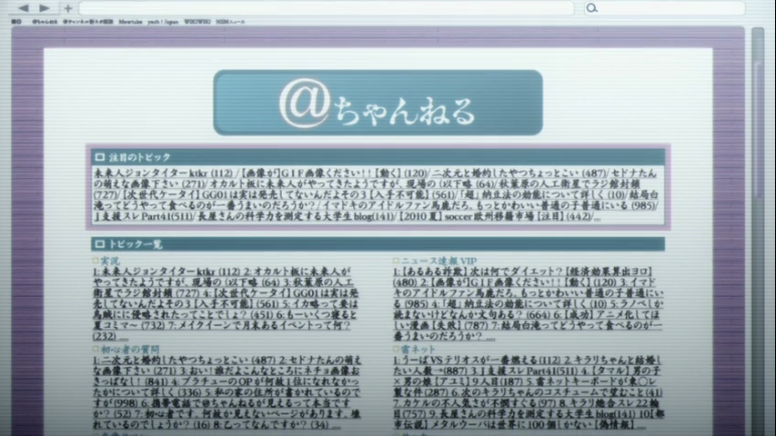 Perusers of the site are called "@channelers". Kurisu Makise is one of these "@channelers" and is ashamed of the fact due to the stigma of @channelers being disconnected and estranged from society and relations. Rintaro Okabe and Itaru Hashida tease Kurisu for this very reason.