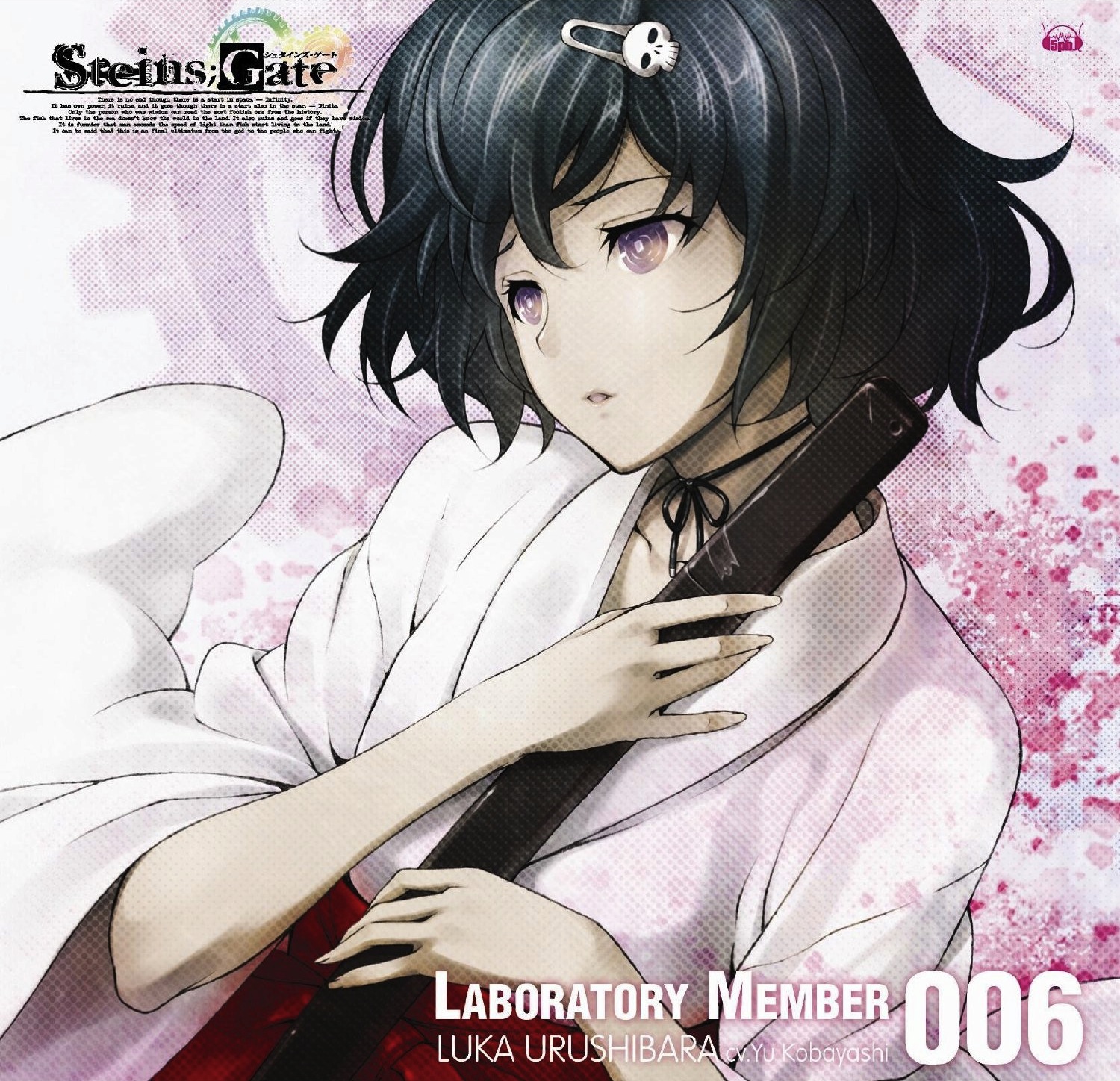 This "Future Gadget Compact Disc" was included in Vol. 5 of the Steins;Gate Blu-Ray. The disc includes the latter 5 dramas of the "Hohoemi Douga no Metafiction" series. Additionally, the disc includes part 2 of "Oudou Teishiki no Hot Spring."