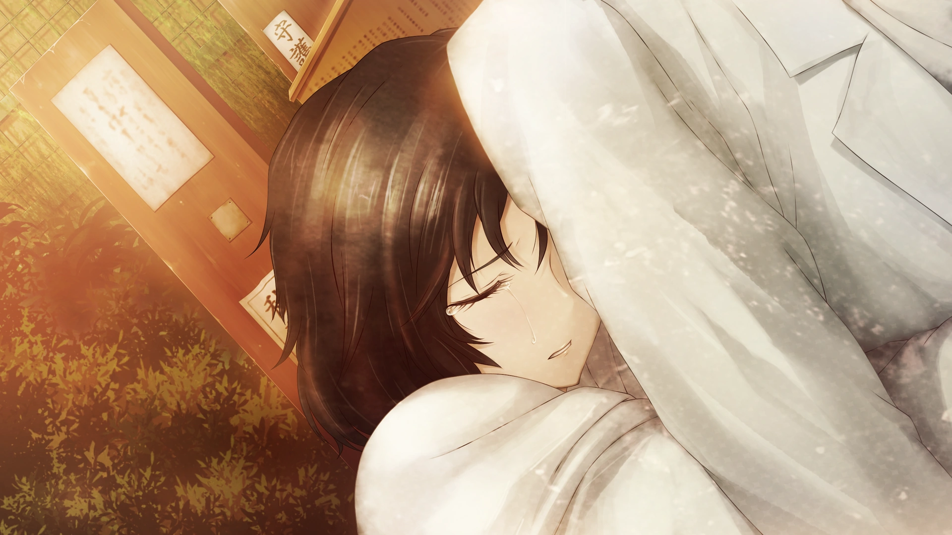 Okabe holding a dying Luka in 2036.