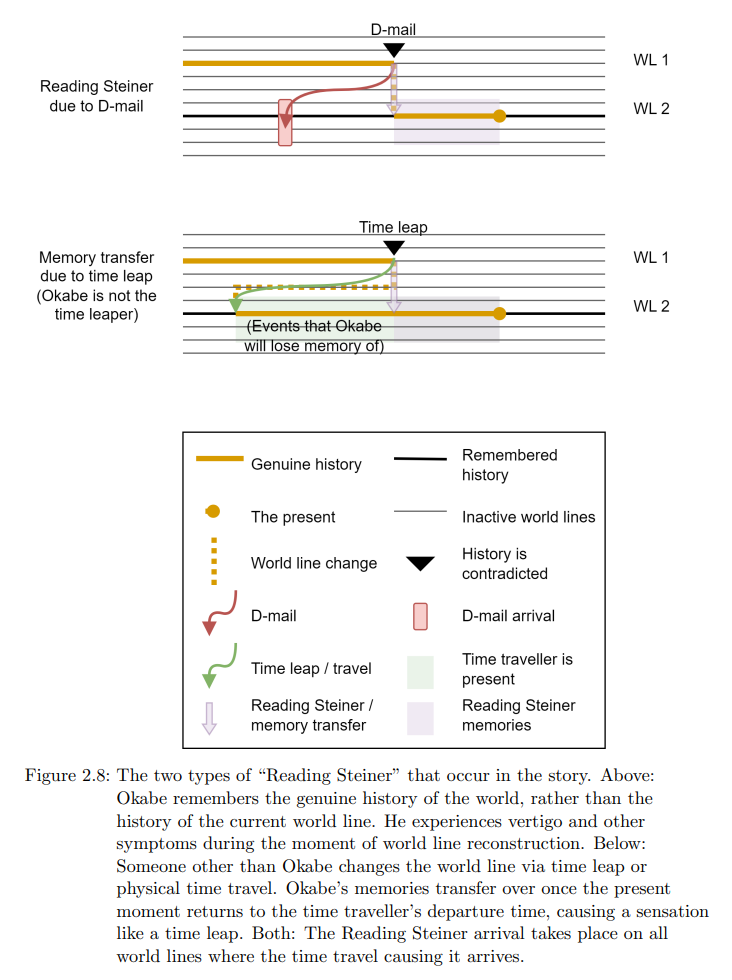 Physical time travellers are another such case where memories are retained, but the specific Reading Steiner sensation is not felt. This is because objects moving between world lines, like D-Mails or time machines, are not subject to the reconstruction that their arrival triggers.[1]