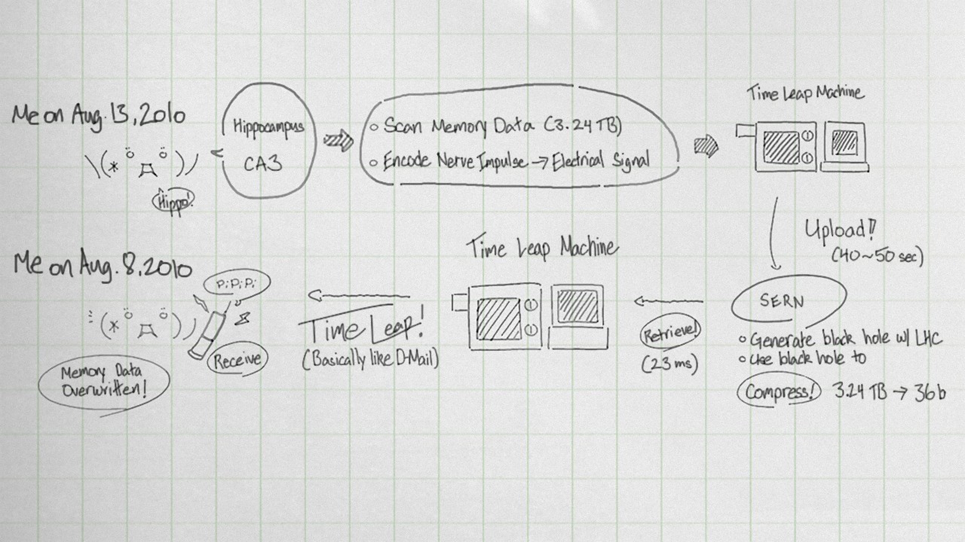 Furthermore, it relies on SERN's Large Hadron Collider to compress all of the data in the human memory into a small enough size to be equivalent to a D-Mail. After that, it relies on similar principles to D-Mail to be sent back in time. The compressed memory data from the hippocampus automatically decompresses upon arrival in the past, using software Itaru Hashida wrote. The person’s past self will hear their phone ring and bring it up near their face, and then the phone will beam the electromagnetic waves full of their future memories directly into their hippocampus, transferring their memories back in time.